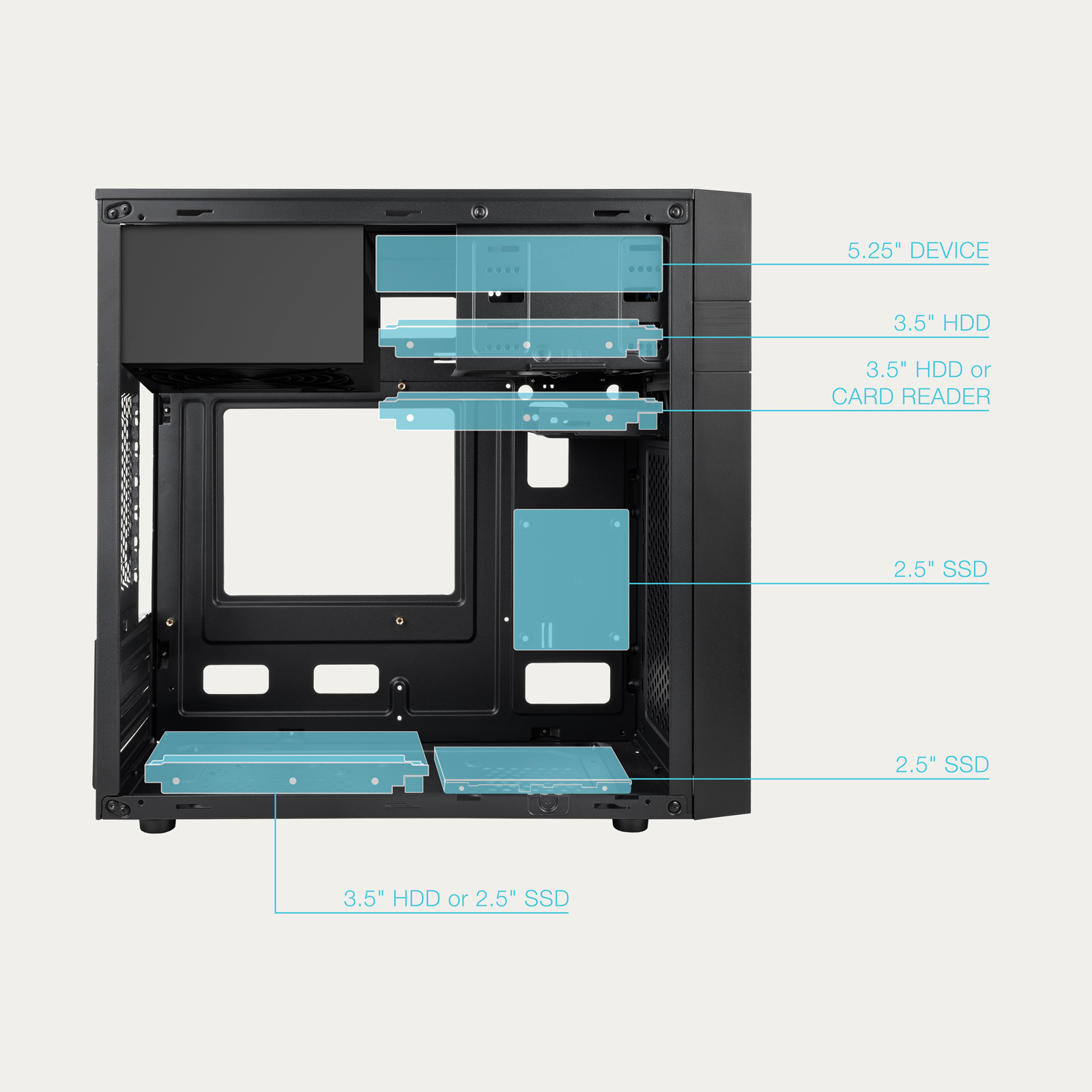 Bahías int.: 3×3,5", 2×2,5" / USB-C + 2×USB3.0 + USB2.0 / MiniTorre con fuente ATX 500W incluida