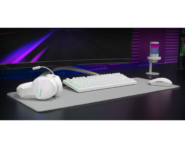 Pack gaming premium 4en1: Teclado TKL con tecnología H-Mech RED, ratón ultraligero RGB Flow de 3200 DPI con switches HUANO, auriculares con iluminación FRGB Rainbow y almohadillas con cancelación de ruido, y alfombrilla XXL con base antideslizante. Compatible con múltiples plataformas, incluyendo PC y consolas, disfruta de sesiones de alto rendimiento. Disponible en negro, blanco y rosa.