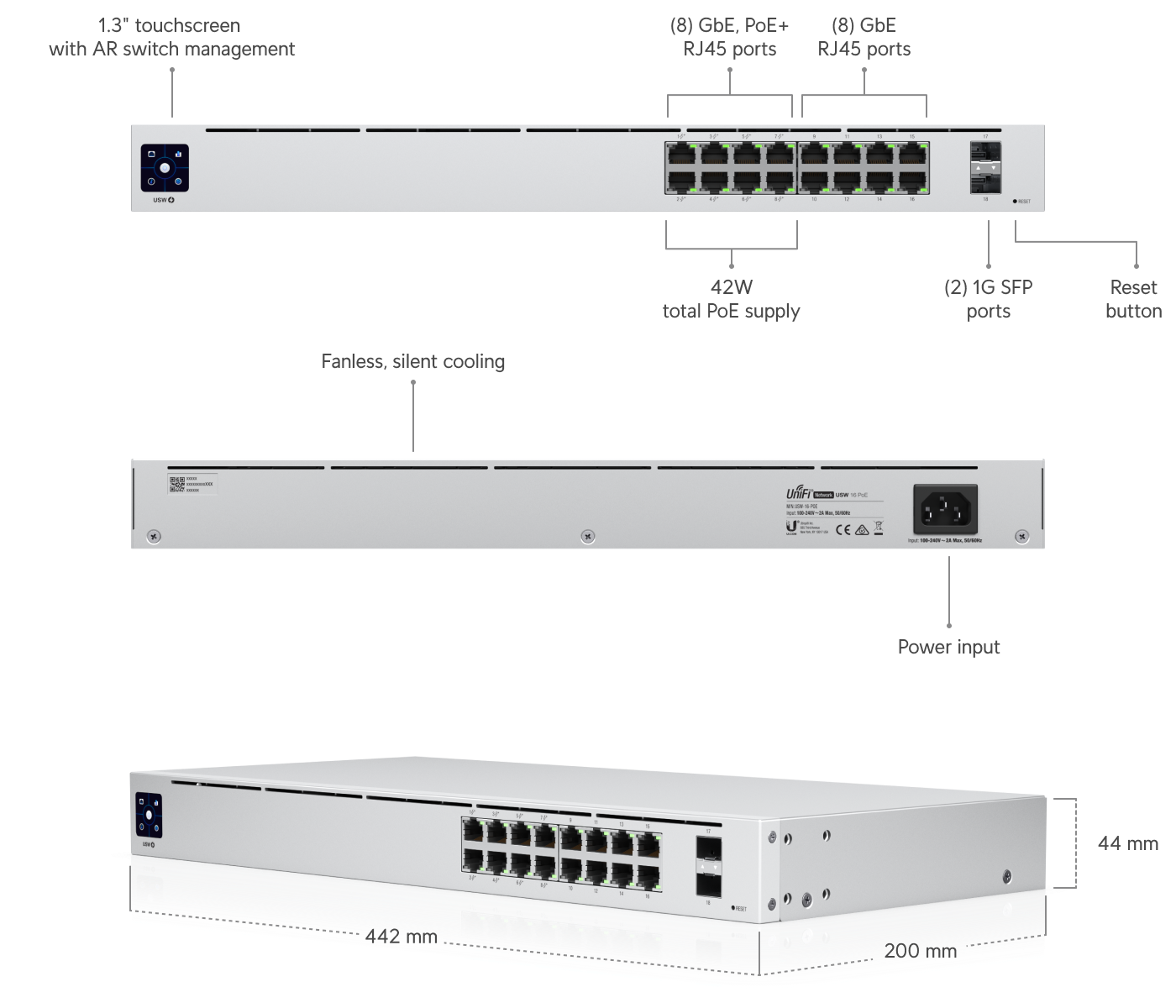 Switch PoE de 16 puertos, capa 2 con un sistema de enfriamiento silencioso y sin ventilador.