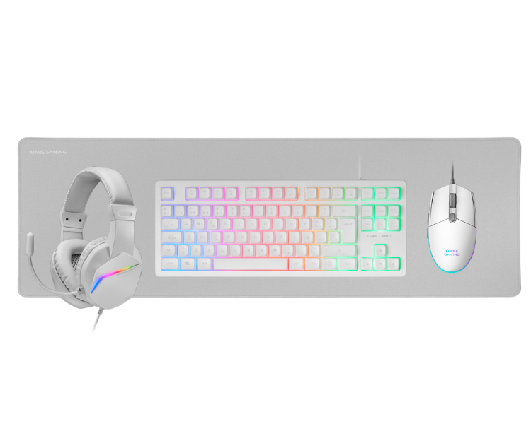 Pack gaming premium 4en1: Teclado TKL con tecnología H-Mech RED, ratón ultraligero RGB Flow de 3200 DPI con switches HUANO, auriculares con iluminación FRGB Rainbow y almohadillas con cancelación de ruido, y alfombrilla XXL con base antideslizante. Compatible con múltiples plataformas, incluyendo PC y consolas, disfruta de sesiones de alto rendimiento. Disponible en negro, blanco y rosa.